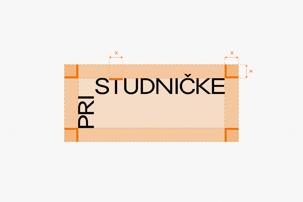 Primárne logo značky Pri Studničke pracuje so zmenou smeru zalomenia. Primárne logo, ktoré v lome oddeluje predložku, môže byť v niektorých prípadoch nahradené alternatívnou verziou loga, ktorá je prelomená v dvoch miestach.